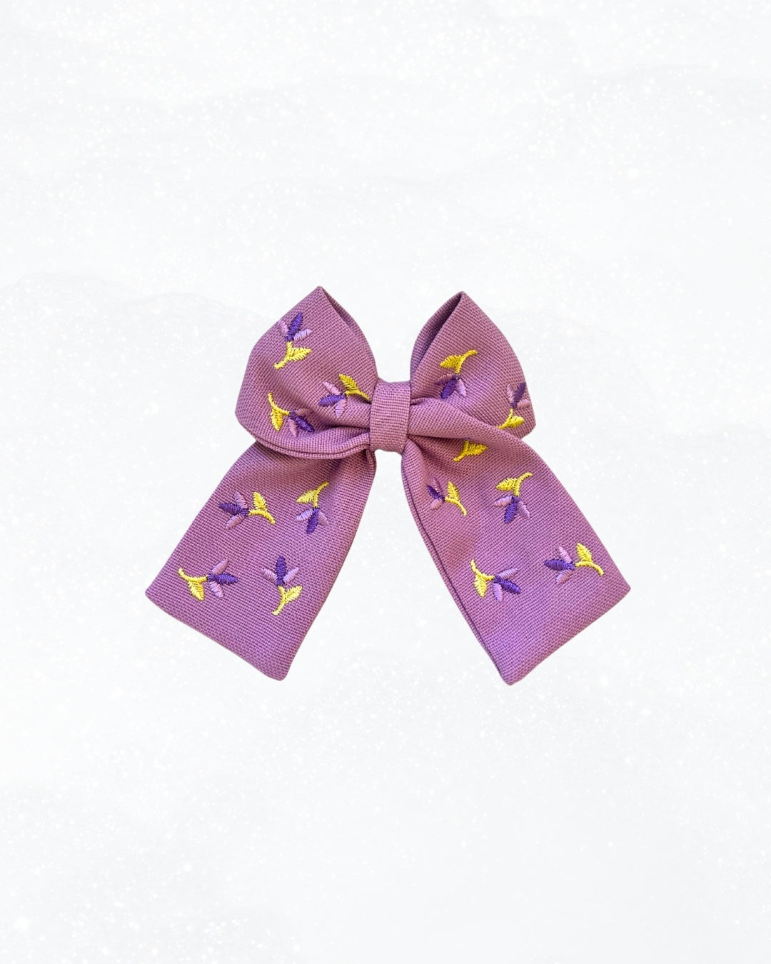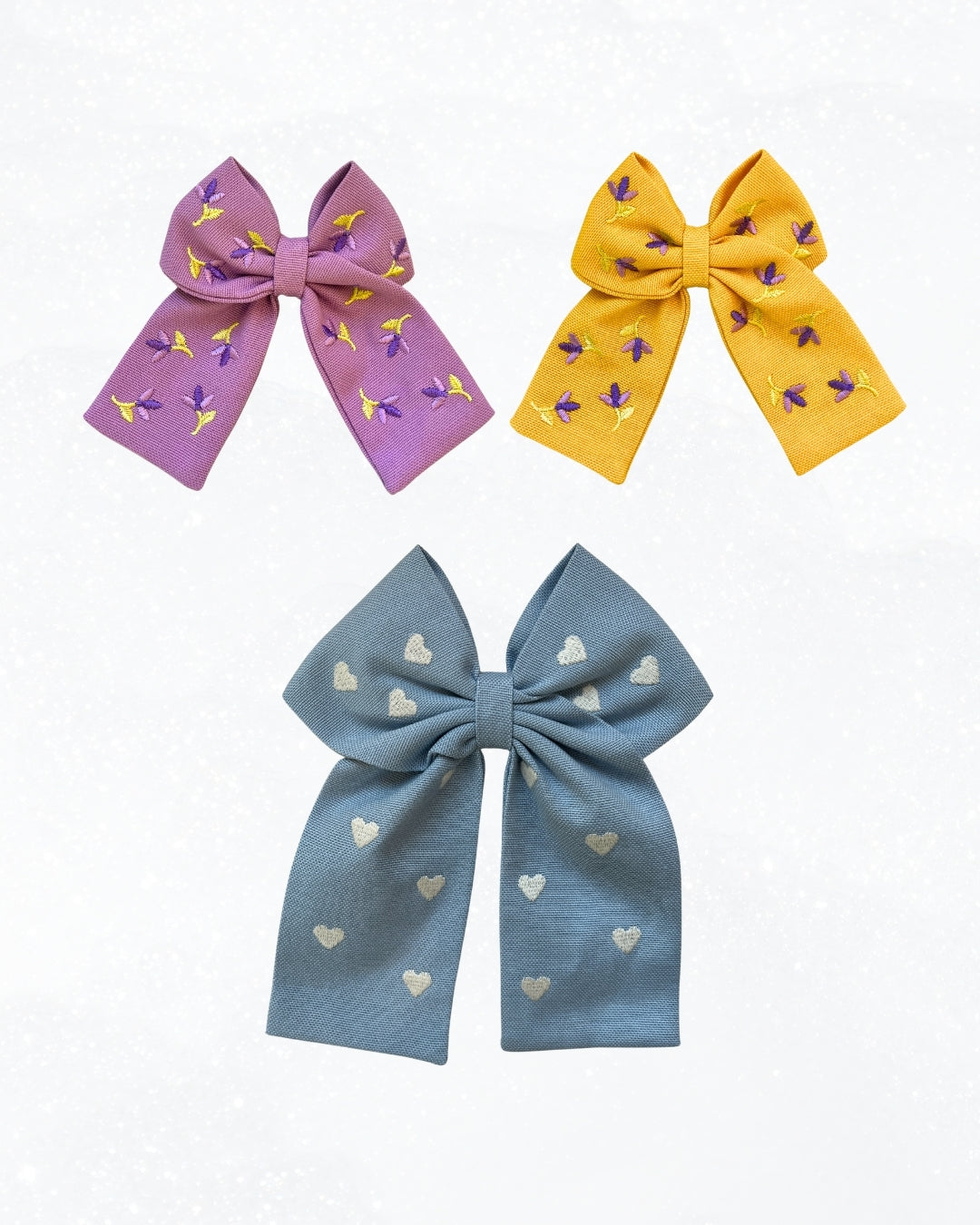 Set içeriği: 1 adet kalp nakışlı mavi fiyonk toka, 1 adet çiçek nakışlı sarı fiyonk toka ve 1 adet çiçek nakışlı lila fiyonk toka bulunmaktadır.