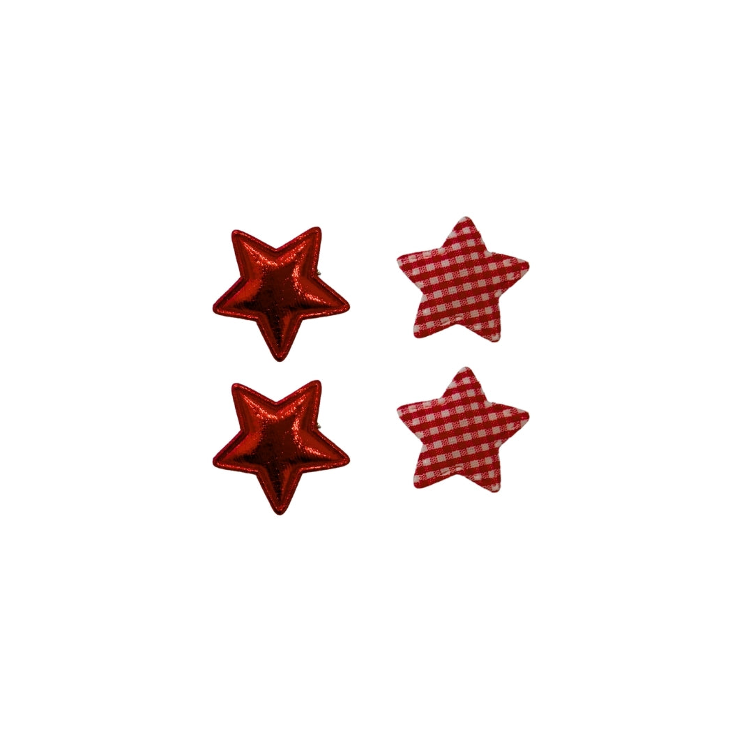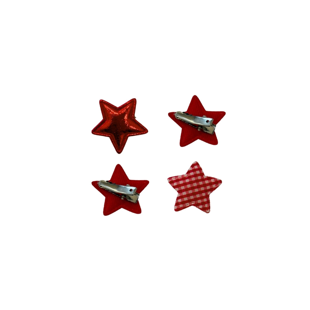Set içerisinde 2 adet kırmızı, 2 adet kırmızı kareli yıldız çıt çıt toka vardır.