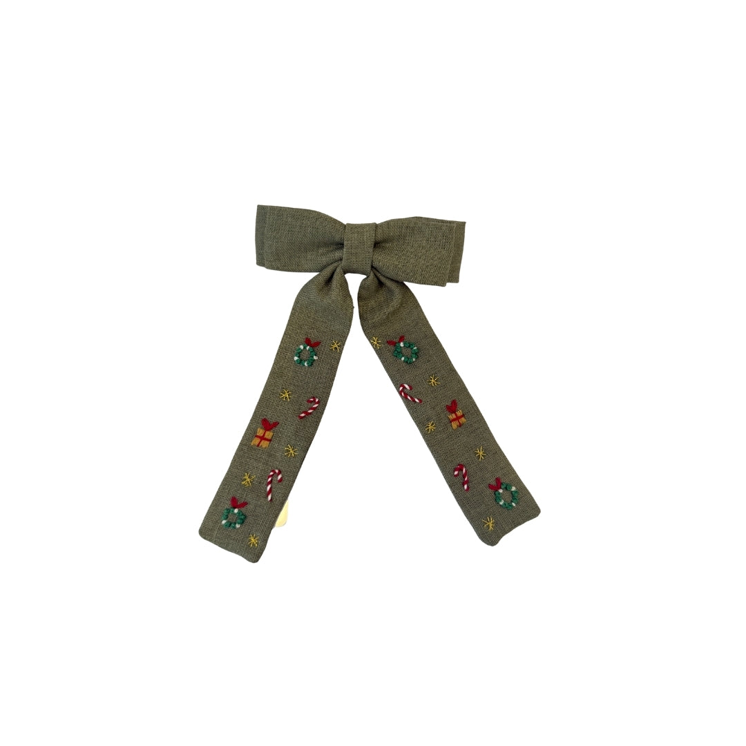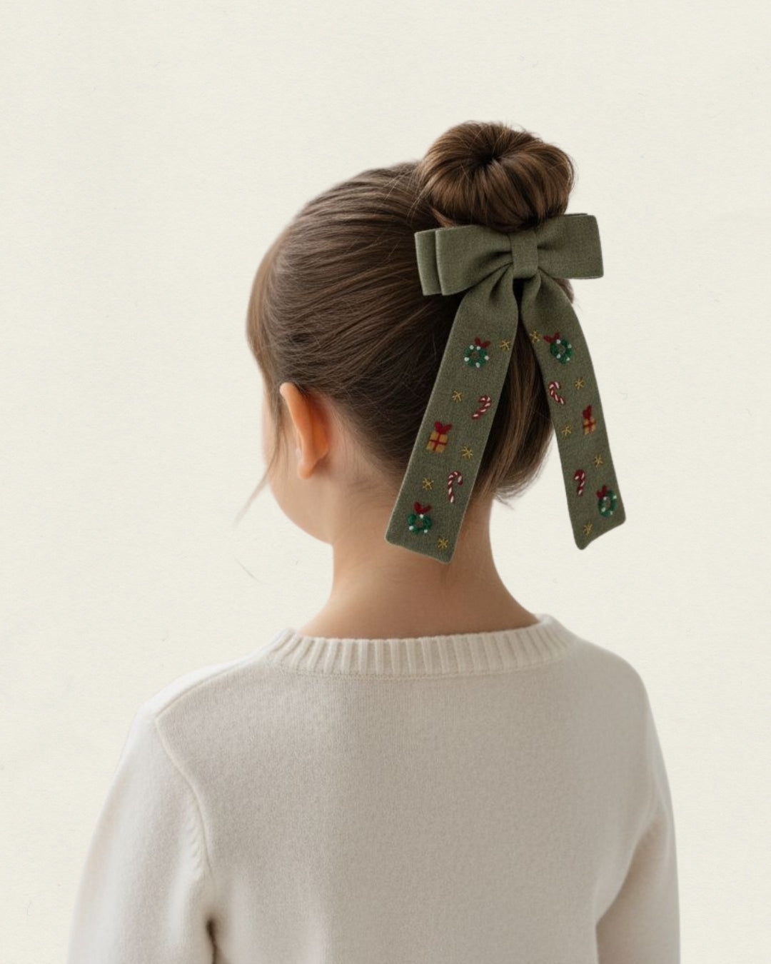 Yılbaşı nakışlı el yapımı yeşil fiyonk toka.