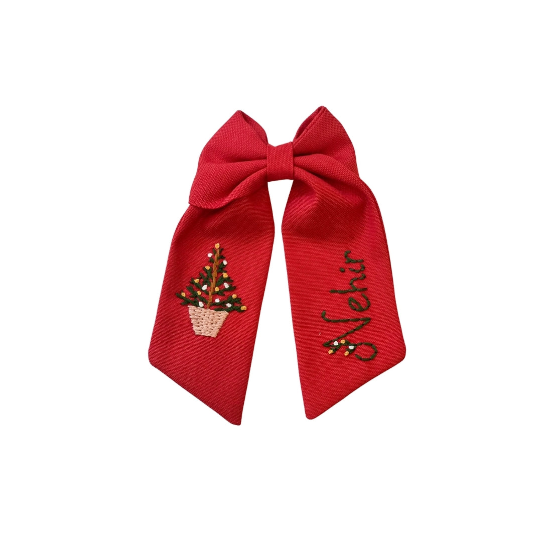 Kırmızı kumaş üzerine isim nakışlı fiyonk toka.