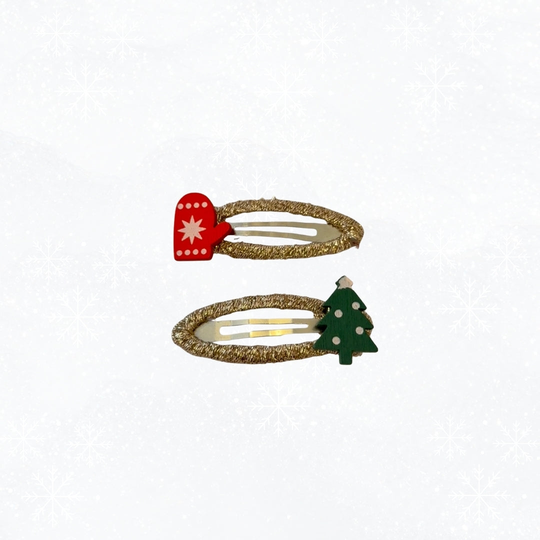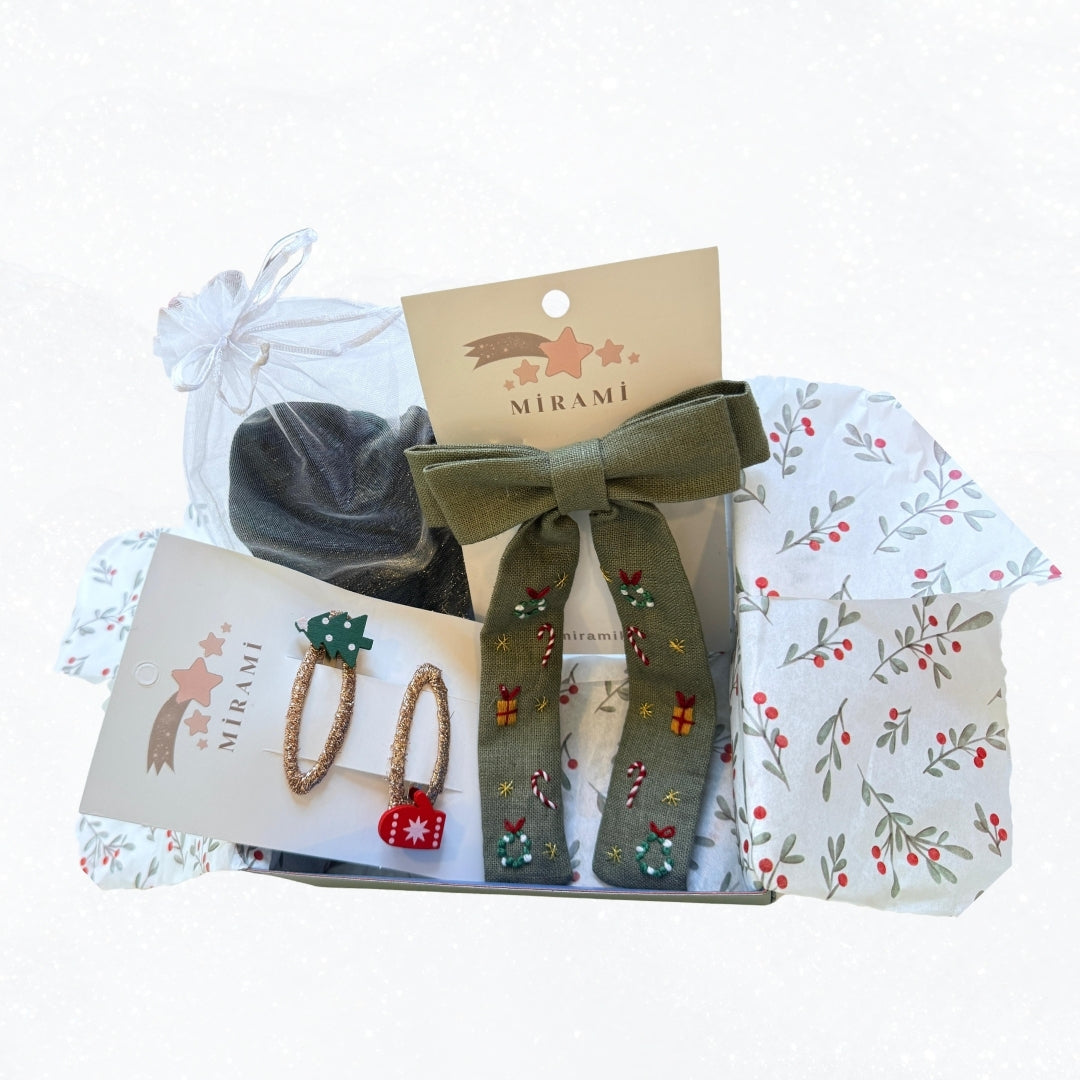 Set içerisinde 1 adet yılbaşı nakışlı fiyonk toka, 1 adet lastik toka, 1 adet 2'li çıt çıt toka bulunmaktadır.
