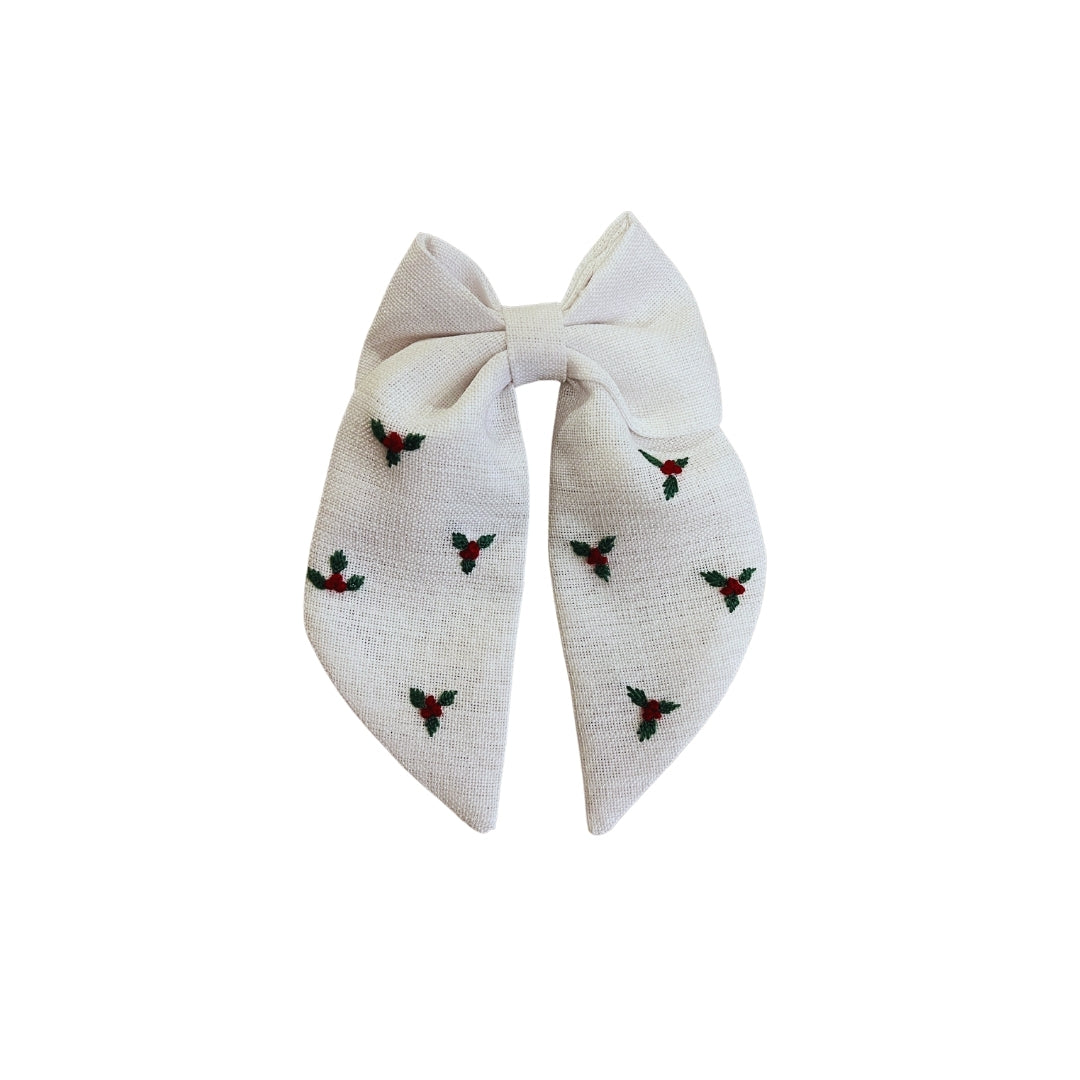 Yılbaşı nakışlı el yapımı beyaz fiyonk toka.
